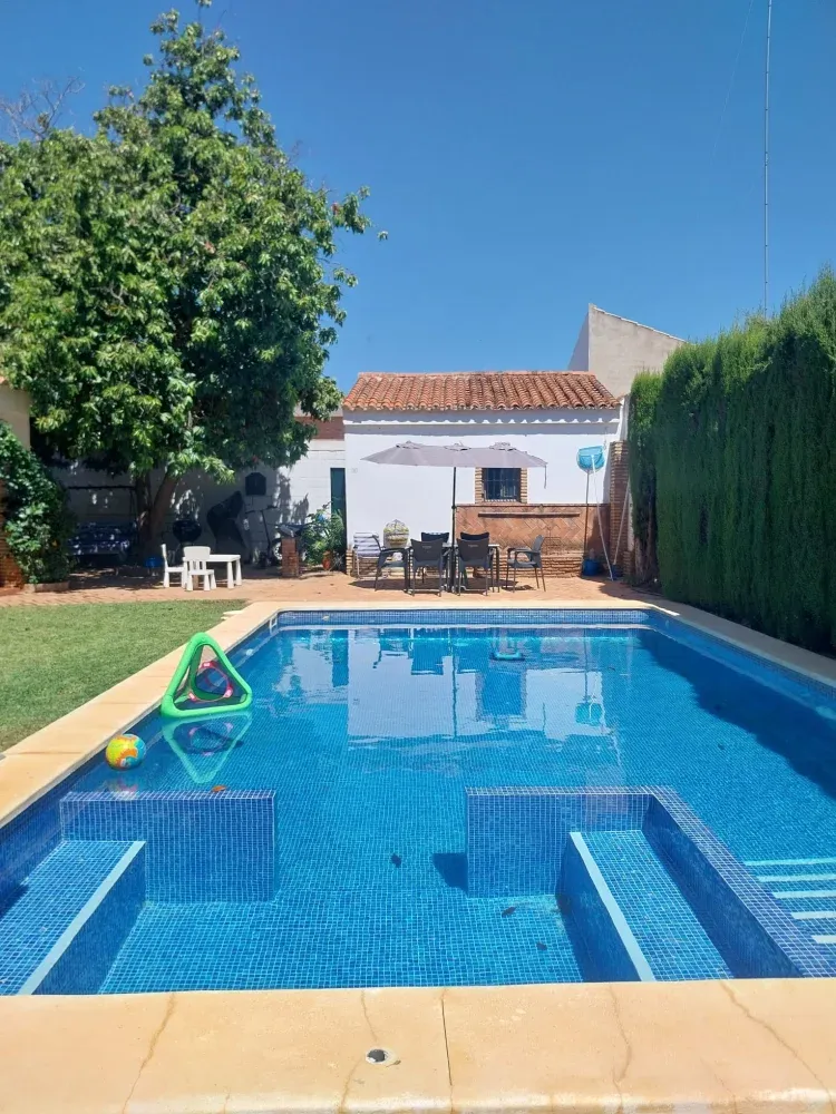 Grandes arboles frutales que dan a la casa sombra natural. Zonas con sombra, zonas soleadas para poder tomar el sol. La casa por dentro es muy amplia, con un salón muy amplio, así como sus dormitorios. Todo a tan solo 15 minutos de Sevilla o Aeropuerto.